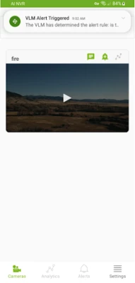 Supports Visual Language Model-powered mobile alerts and chatting, allowing natural language alerts on video streams with push notifications for detected events. The app presents a chat interface for follow-up questions upon receiving notifications.